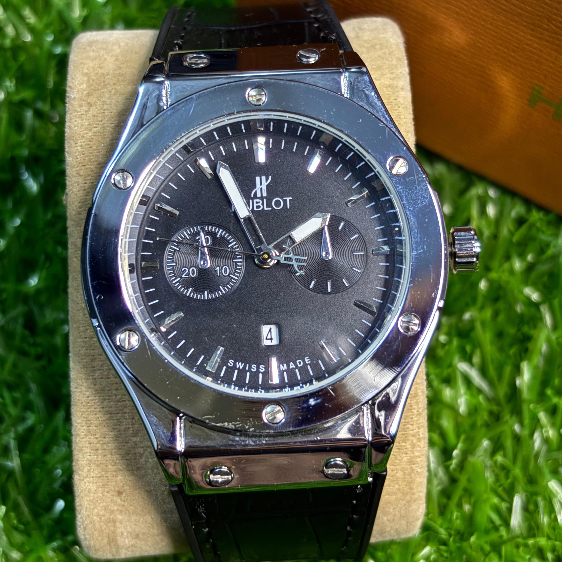 Elegance meets power in the Hublot Classic Chronograph – Black Edition, a timepiece that radiates timeless sophistication. With a sleek black dial and silver-polished bezel, it brings together the perfect harmony of bold styling and precision functionality.