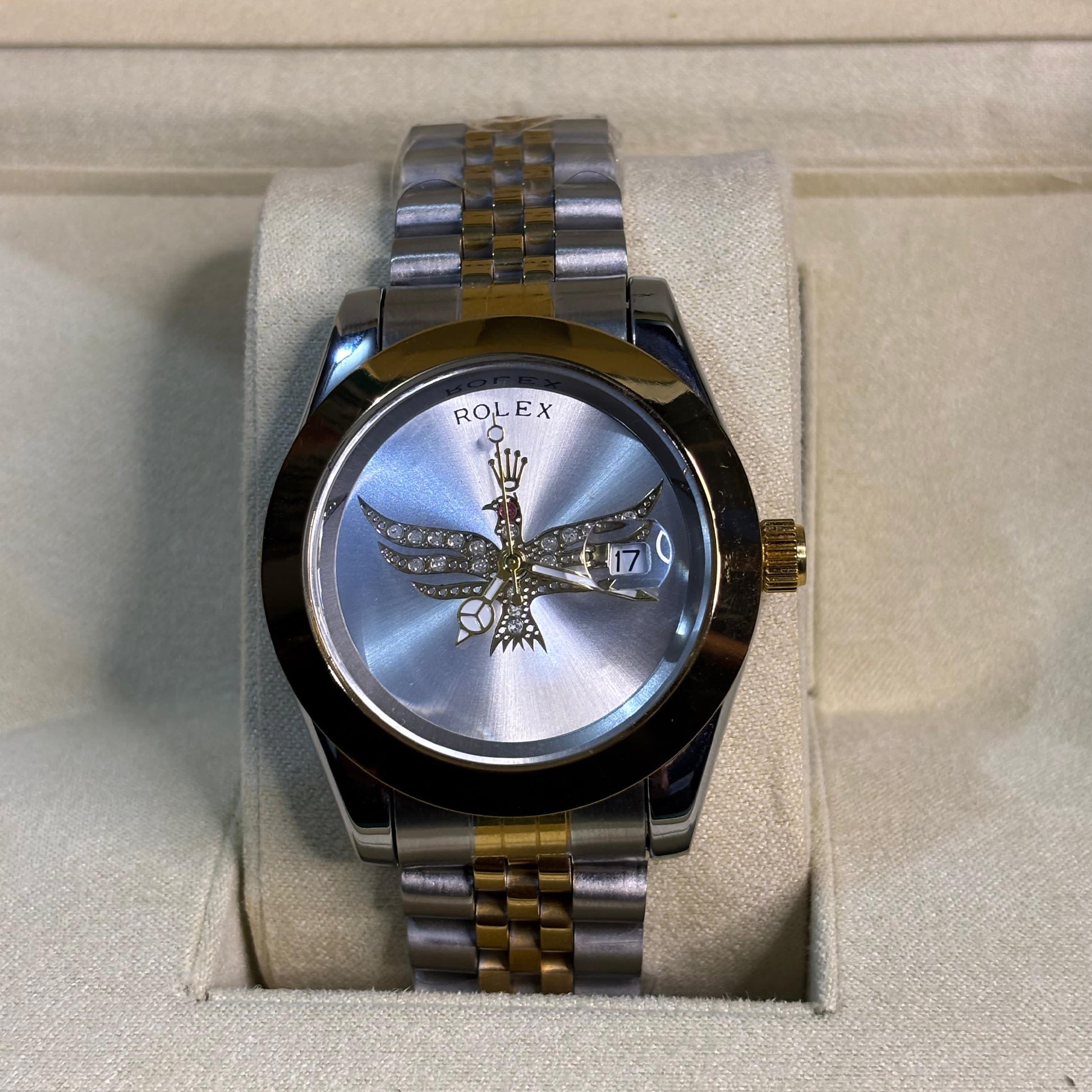 This bold and eye-catching timepiece features a silver sunburst dial with a unique eagle emblem design encrusted with shining stones. The date display at 3 o'clock and two-tone Jubilee bracelet (gold and silver) add a luxurious and powerful flair. A perfect blend of custom artistry and classic style, ideal for collectors or standout fashion statements.