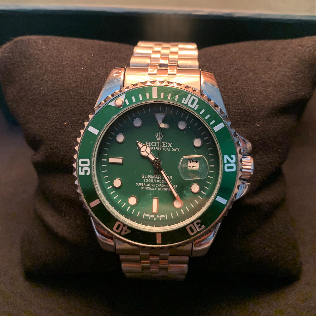 Make a bold statement with the iconic Rolex Submariner Date featuring a striking green dial and bezel. Revered by collectors and enthusiasts, this timepiece is renowned for its perfect blend of luxury, performance, and timeless design.